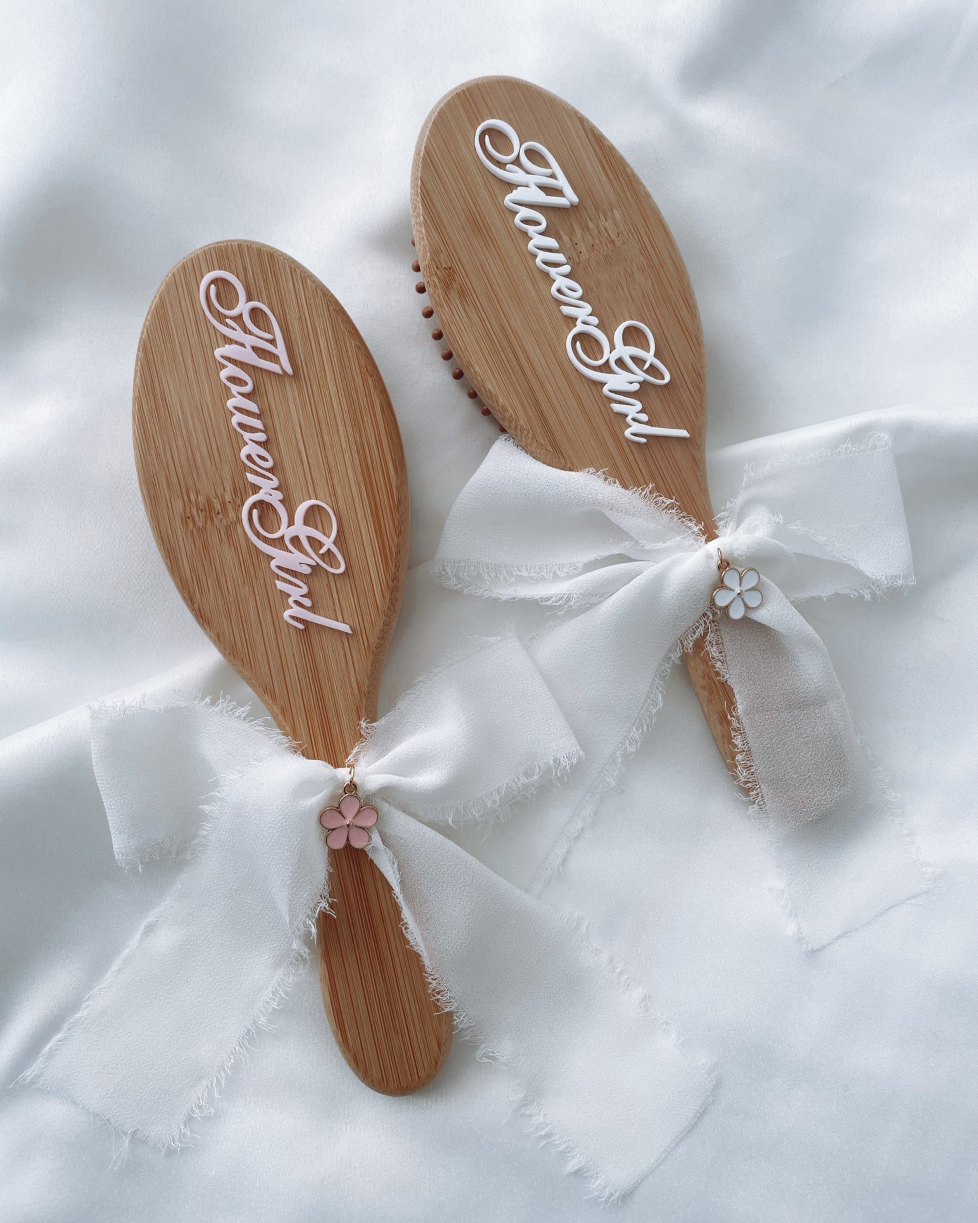 This gorgeous wooden hairbrush is the perfect gift for your flower girl. It features a delicate, natural wooden handle made from smooth, light wood. The brush’s head is gently curved, with soft rubber bristles designed to be gentle on the hair and scalp.