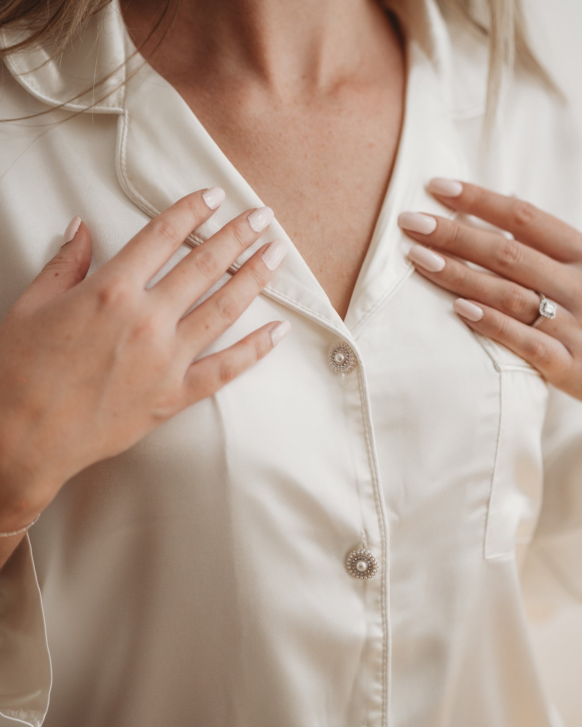 The silky fabric feels luxurious against the skin, a must have for the morning of your wedding day! These pjs feature diamanté pearl buttons with a long sleeve collared top and long leg bottoms with pockets an elastic waistband making for a comfortable and flattering fit